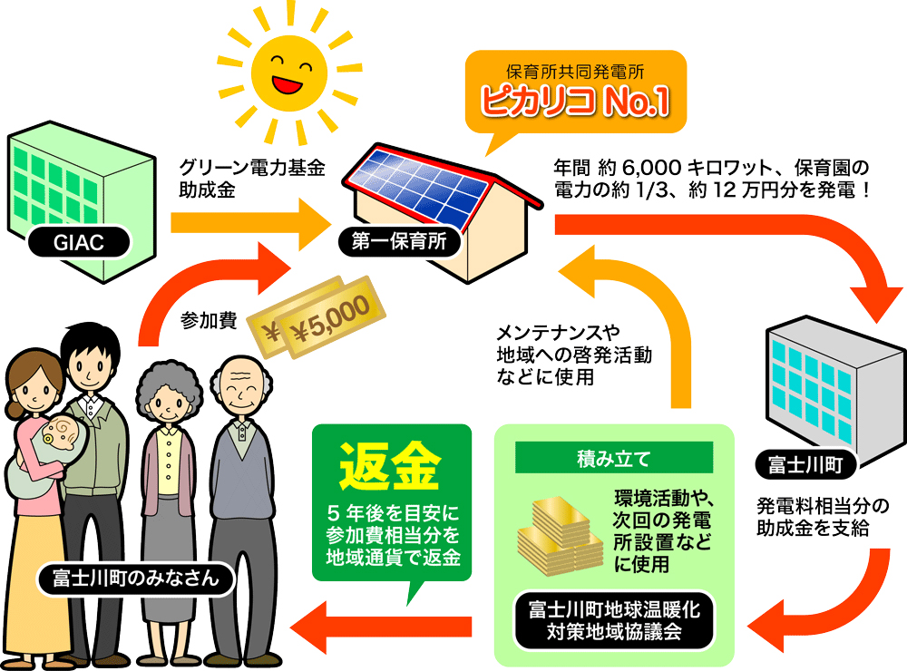 保育所共同発電所設置の参加費は一口5000円として、富士川町のみなさんから提供していただきました。多くのみなさまにご協力いただき、ありがとうございました。「ピカリコ No.1」が発電した分の電気料金は、富士川町から助成金として支給されます。助成金は積み立てられ、2013年には、町内で使える地域通貨として、参加していただいた富士川町のみなさんにお返ししました。